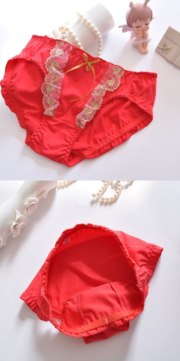 日系中國大紅色全棉純棉性感刺繡飛邊內褲